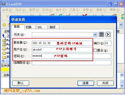 2.在彈出窗口處,輸入 “服務(wù)器IP地址、 FTP用戶名、FTP密碼”,然后點(diǎn) “連接”