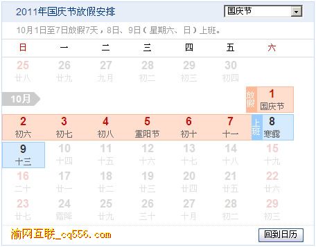 根據(jù)國(guó)務(wù)院《關(guān)于修改<全國(guó)年節(jié)及紀(jì)念日放假辦法>的決定》,為便于各地區(qū)、各部門及早合理安排節(jié)假日旅游、交通運(yùn)輸、生產(chǎn)經(jīng)營(yíng)等有關(guān)工作,根據(jù)國(guó)務(wù)院辦公廳通知精神,重慶網(wǎng)絡(luò)公司渝網(wǎng)互聯(lián),2011年國(guó)慶節(jié)的放假通知。