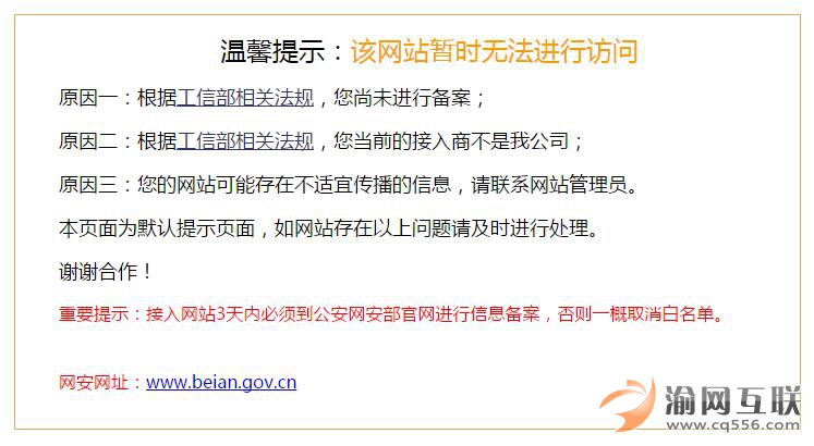 望各位網(wǎng)站管理人員,提前作好備案,免得因?yàn)檫@樣的事情,導(dǎo)致網(wǎng)站各法正常訪問而影響重慶公司業(yè)務(wù)的發(fā)展。